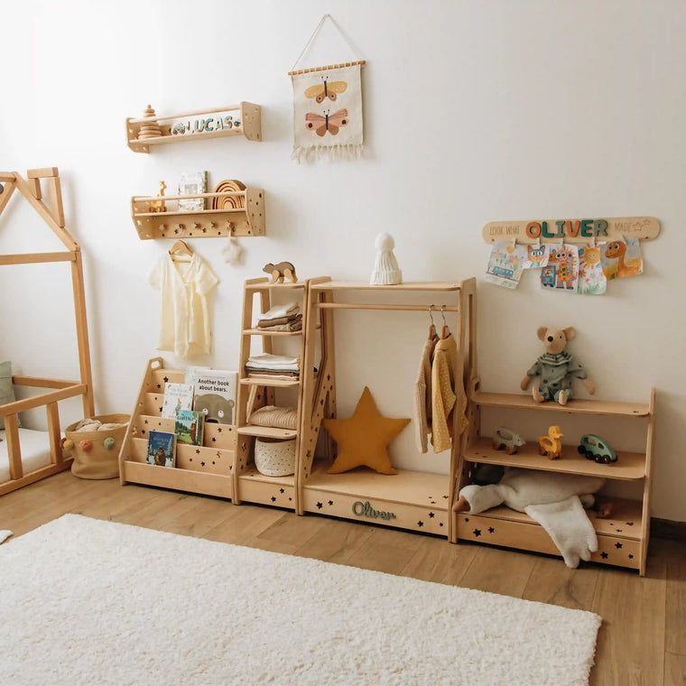 Introduce a beautifully craftedmontessori kids wardrobe & shelf set—aset of 4 shelvesperfect for a nursery or child’s room. Made from solid wood with non-toxic finishes, thiscustom wooden bookshelf & clothes rackencourages independence and organization. Ideal as akids closetorbaby room furnituregift.