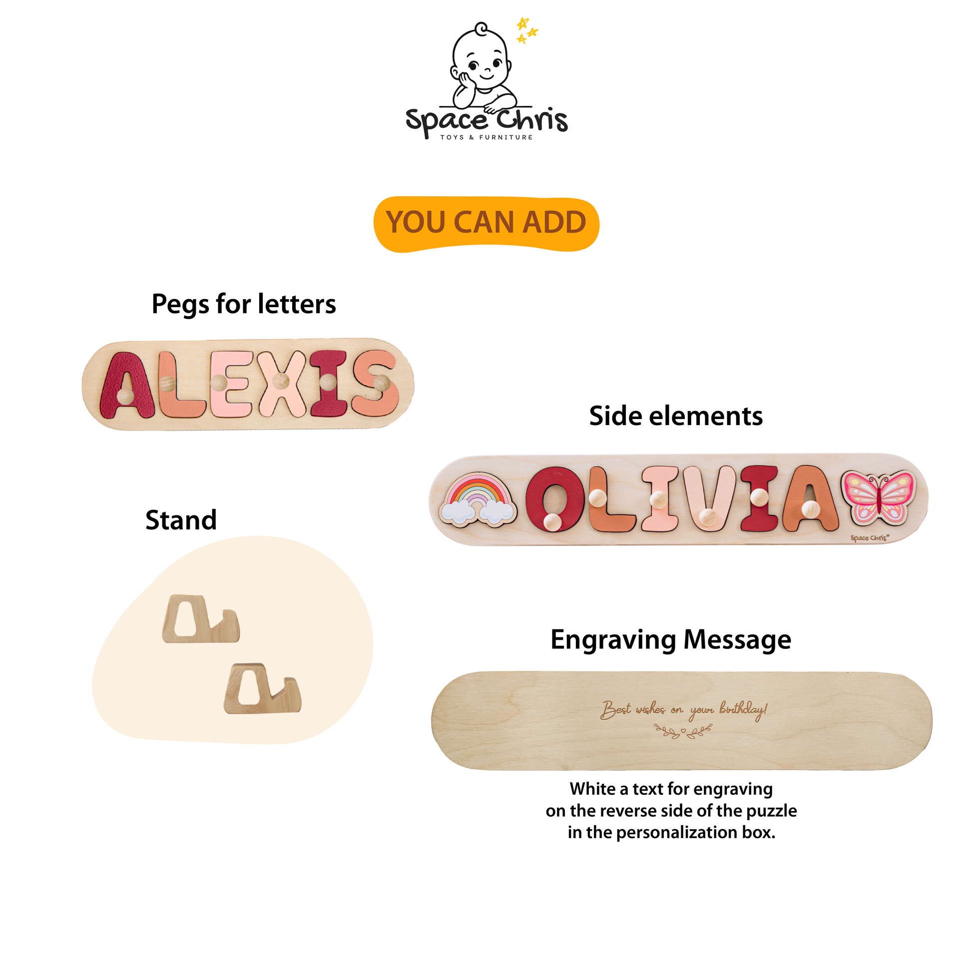 Make learning fun with our custom wooden name puzzle with pegs, designed to help toddlers recognize letters, improve fine motor skills, and enjoy hours of playful learning. A perfect gift for a 1st birthday, baby shower, or nursery decoration.
